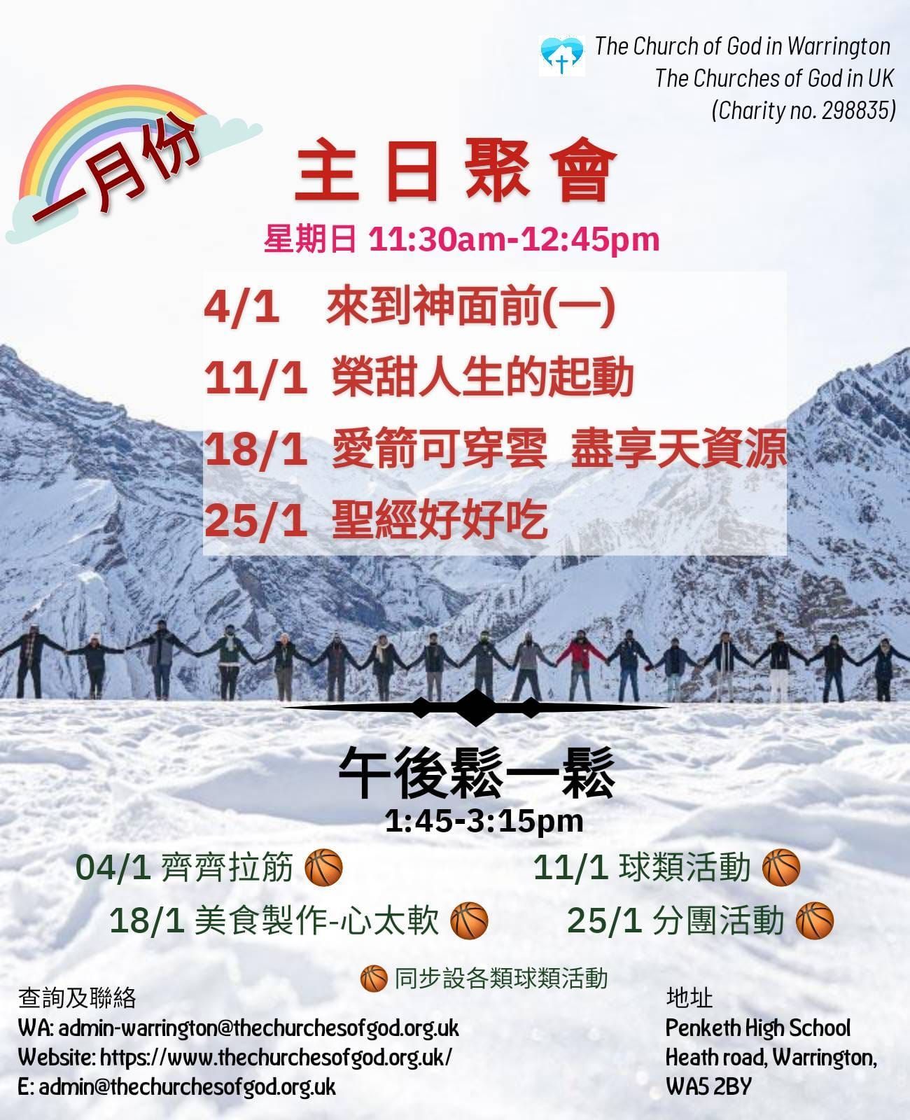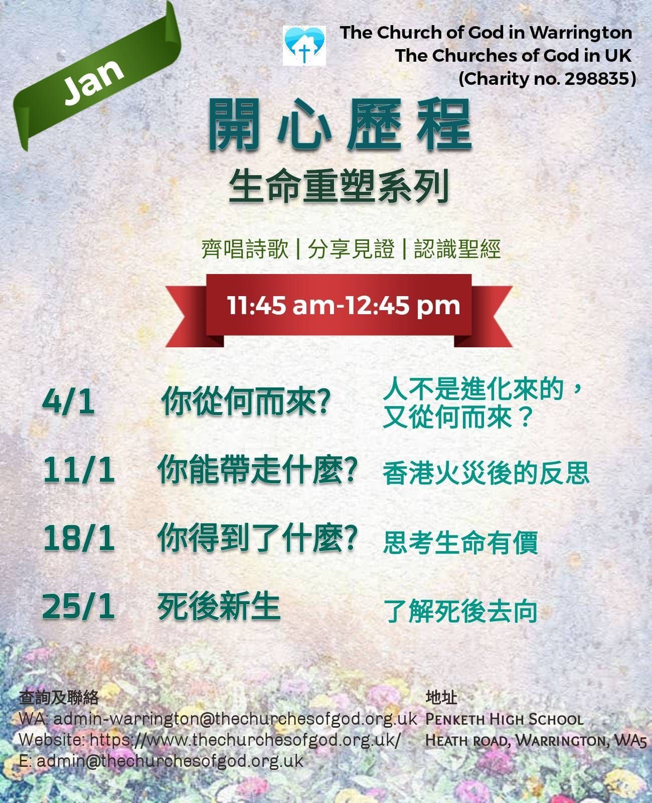 由於大家都有共同的移居目的地,我們十多位基督徒便相約在2021年5月23日在網上聚會,彼此認識、一同敬拜和為着在 Warrington (沃靈頓) 建造教會祈禱。這就是「沃靈頓神的教會」(The Church of God in Warrington) 的第一次主日聚會,一個十分可紀念的日子。